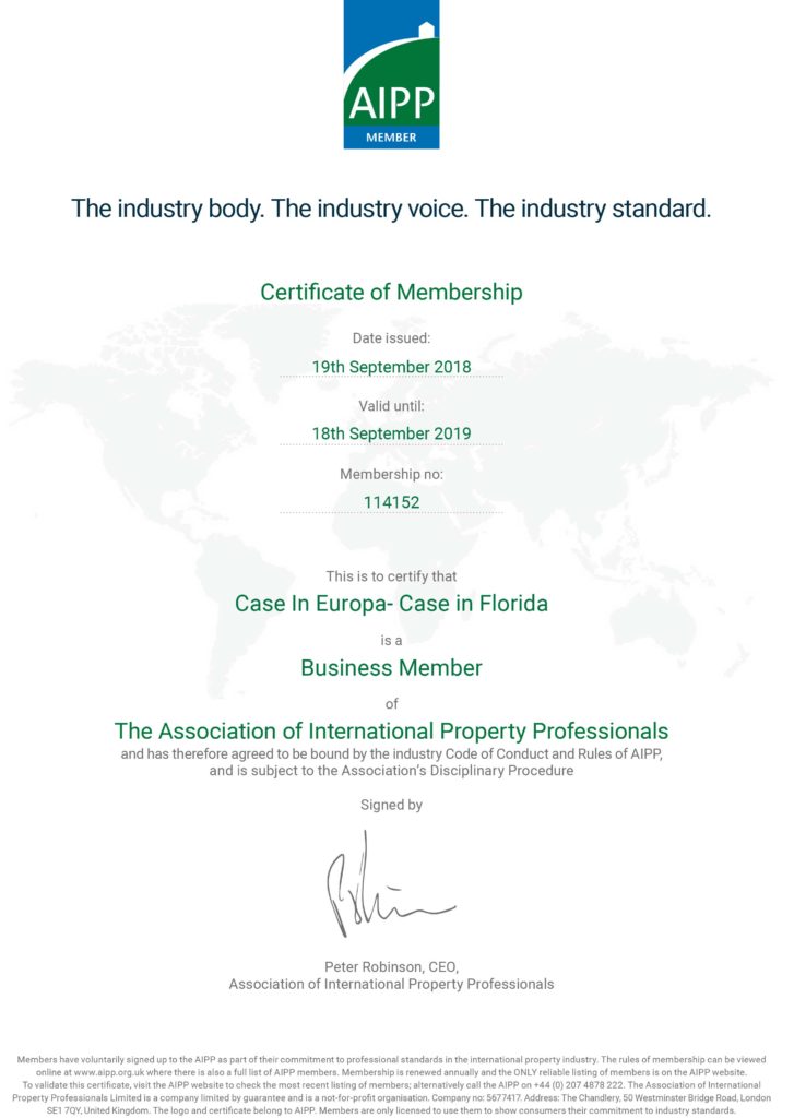 L’ AIPP è l’Associazione dei Professionisti esperti in Affari Immobiliari Internazionali ed è basata su un codice di condotta professionale e su qualità certificate dei propri appartenenti. Il codice di condotta della AIPP garantisce e aiuta i clienti a verificare se la società con la quale stanno trattando è degna di fiducia e se ha la necessaria esperienza negli investimenti internazionali. Per essere accreditati bisogna dimostrare un’esperienza pluriennale negli affari immobiliari internazionali ed essere “senza macchia” e nel nostro caso sono stati contattati Avvocati ed altri professionisti americani ed inglesi a testimonianza delle nostre credenziali.